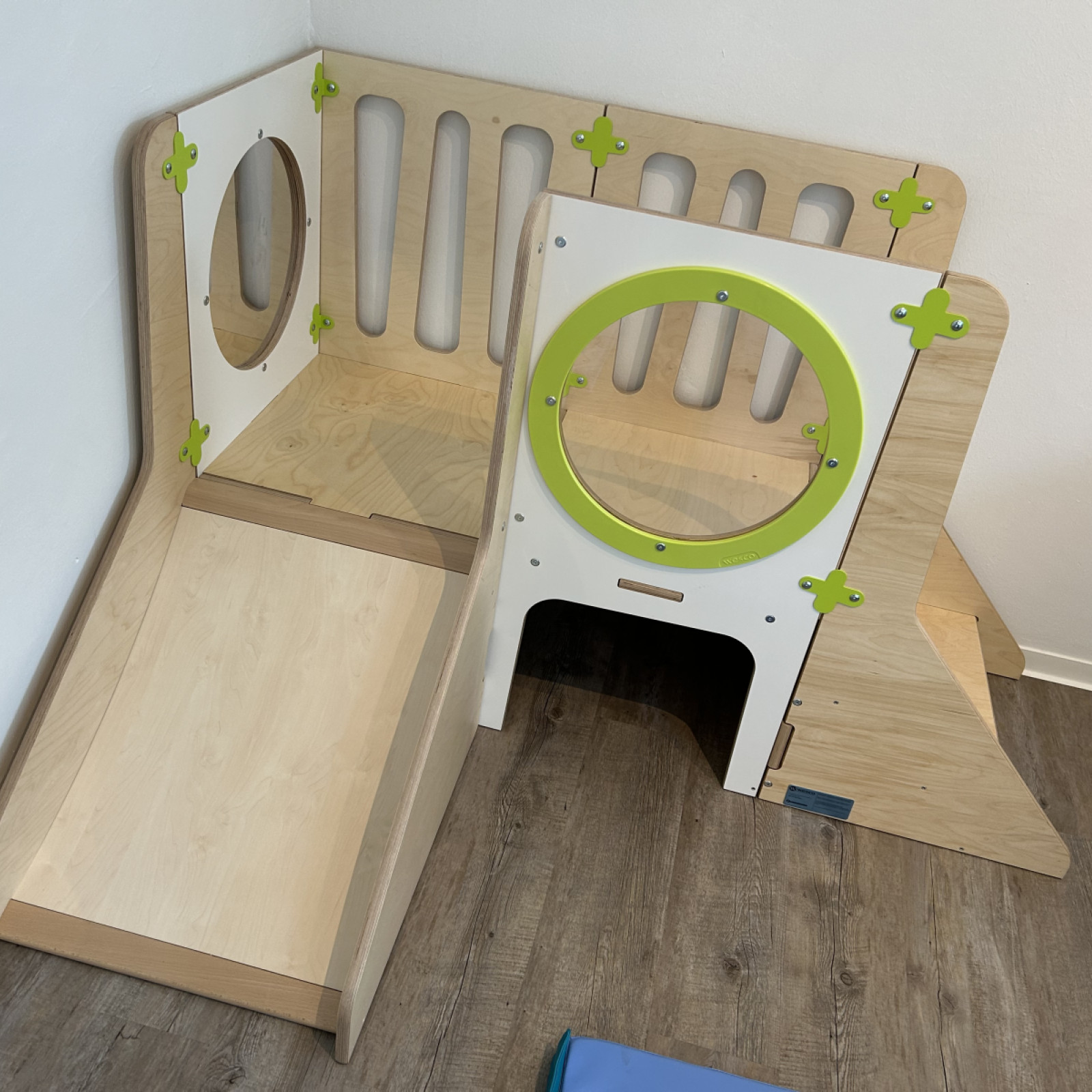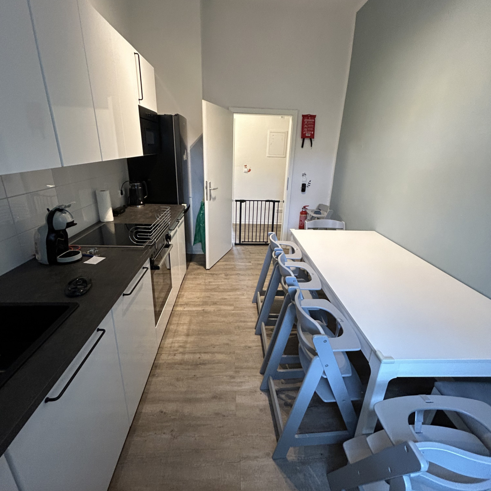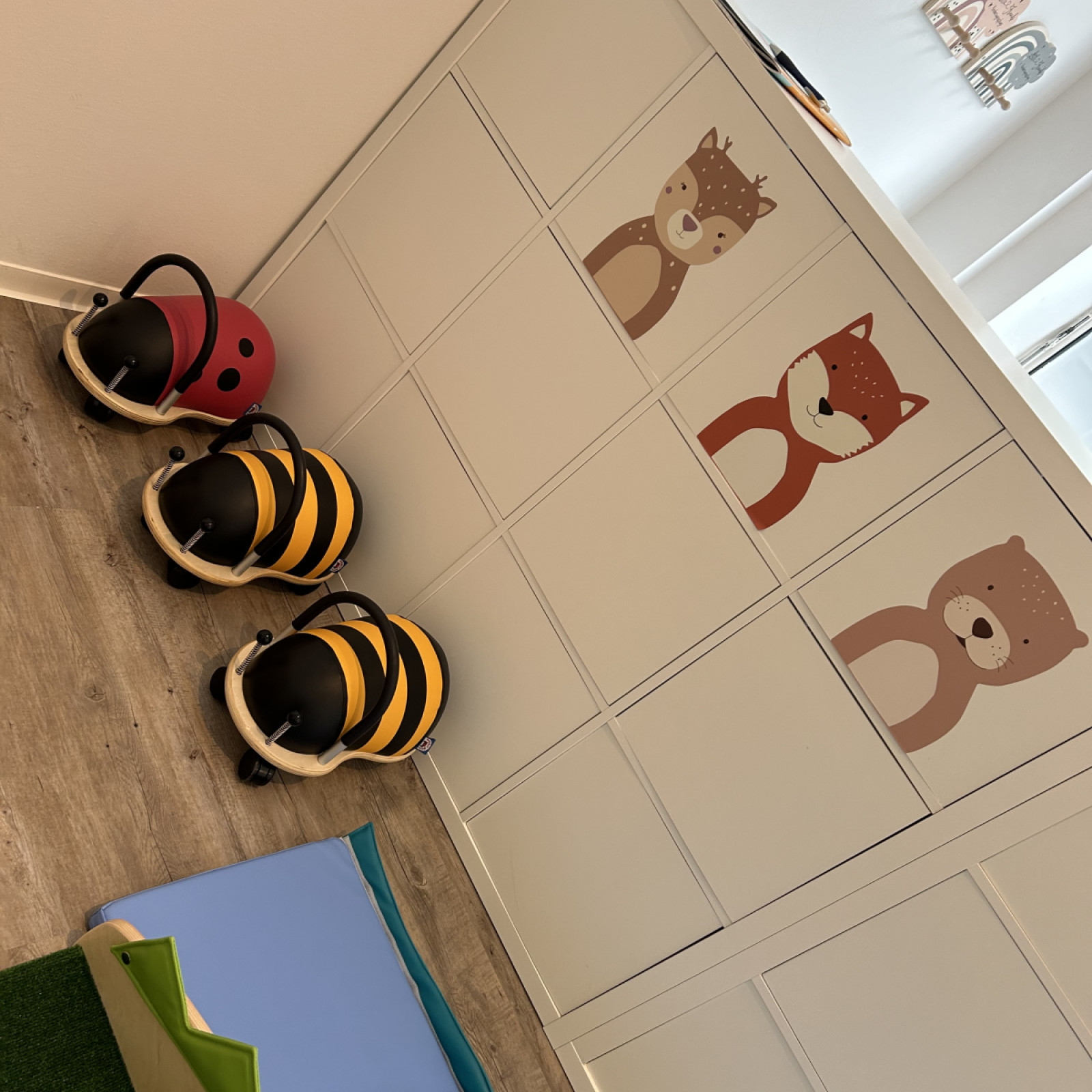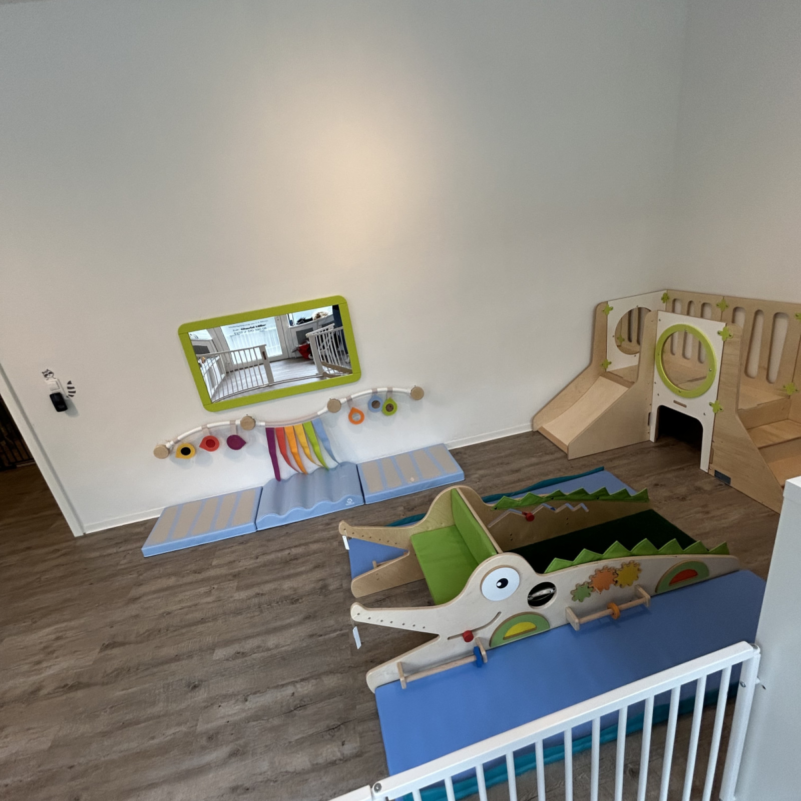 Kinder haben besondere Bedürfnisse an die Einrichtung: der Waschbereich hat einen Wickeltisch, Waschbecken und eine Toilette. Für den Mittagsschlaf oder um sich auszuruhen gibt es den Schlafbereich mit einer eigenen Matratze für jedes Kind. Die Küche ist besonders wichtig: hier bereiten wir – auch oft gemeinsam mit den Kindern – die Mahlzeiten zu und lassen es uns zusammen am großen Tisch schmecken. In den Räumen gibt es verschiedene Bereiche zum Basteln oder Spielen – manche Bereiche werden auch für verschiedene Anlässe umgeräumt.